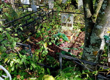 Данное место захоронения оформлено очень просто: простой памятник на двух покойных, отсутствие наземного покрытия, а также простая металлическая оградка. Цветник выполнен в форме обычной кадки, а помимо него на участке присутствует только одно естественное украшение – дерево.