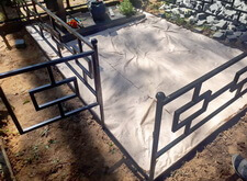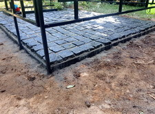 Затем мы сварили по периметру могилы борта из металлических полос, которые и будут являться границей брусчатки. Земля была застелена геотекстилем, который и предотвратит прорастание травы сквозь швы между плитками.